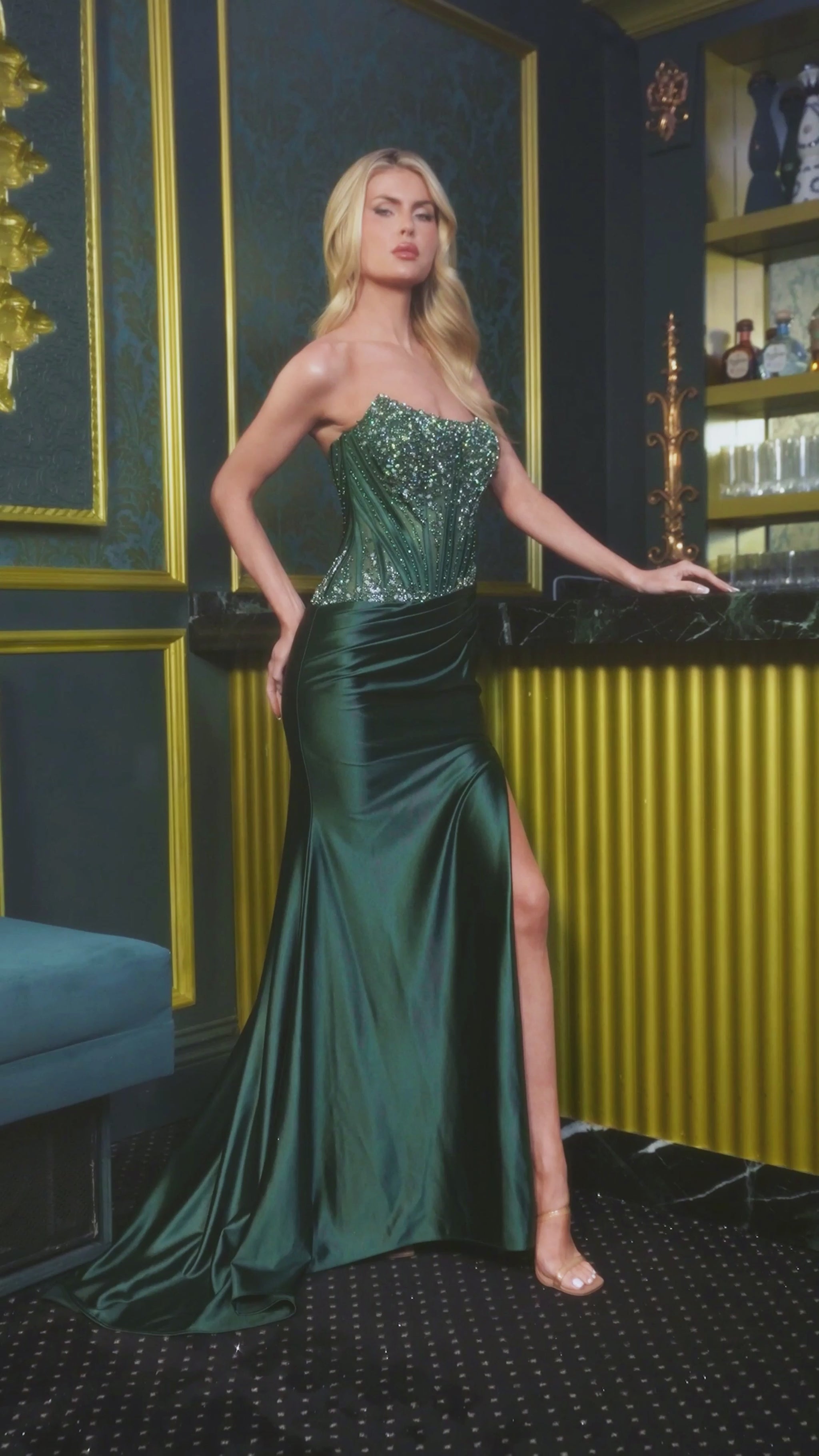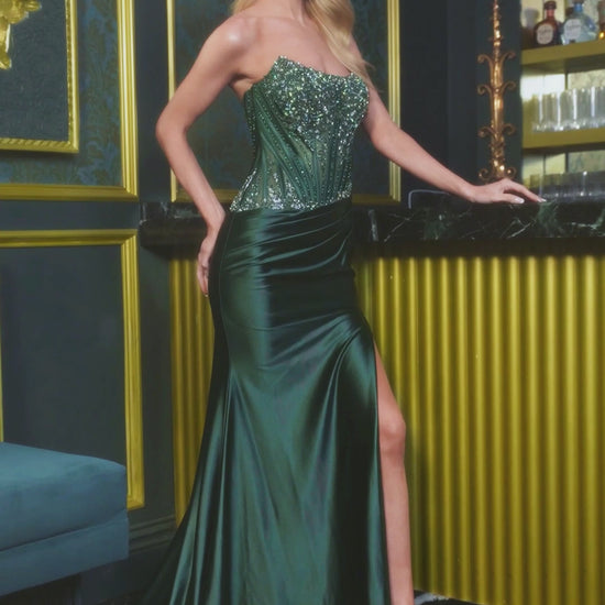 Denne stropløse kjole har et flot og figursyet snit med en smuk talje med lave draperinger, som giver en pæn og feminin form. Overdelen er pyntet med perler og fine detaljer.