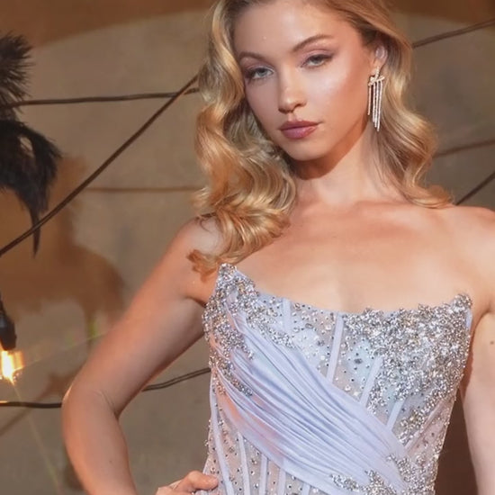 Denne stropløse kjole har et flot, tætsiddende snit med en markeret talje, som giver en pæn og feminin form. Overdelen er pyntet med perler og broderede detaljer, der giver kjolen et elegant udtryk.