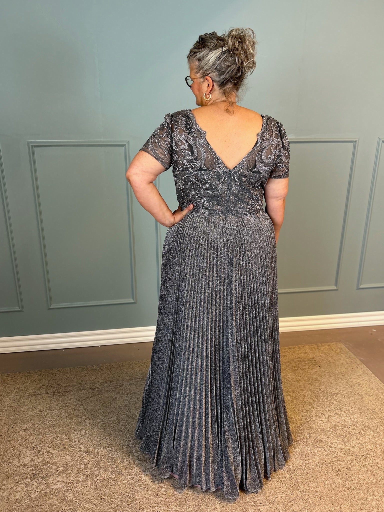Kjolen er syet i en smuk sølvgrå farve med et let glimt, der fanger lyset på en diskret og raffineret måde. Overdelen er pyntet med fine blonder og små pailetter, som giver et eksklusivt og feminint udtryk.