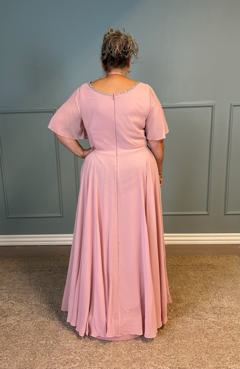 Denne smukke rosa festkjole er det perfekte valg til dig, der ønsker et feminint og elegant look. Kjolen har en flatterende A-facon, korte flagrende ærmer og et klassisk snit, der giver et let og luftigt udtryk.