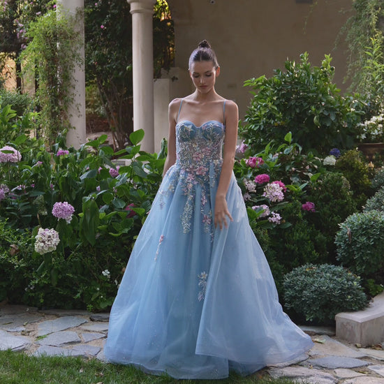 Denne betagende Andrea & Leo festkjole er som skabt til dig, der vil føle dig som en prinsesse for en aften. Kjolen har en smuk, figursyet overdel med fine stropper og delikate blomsterbroderier, der fortsætter ned i det lette tylskørt. De pastel-farvede detaljer og den glitrende overflade giver kjolen et magisk og eventyrligt udtryk.