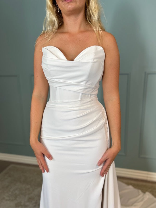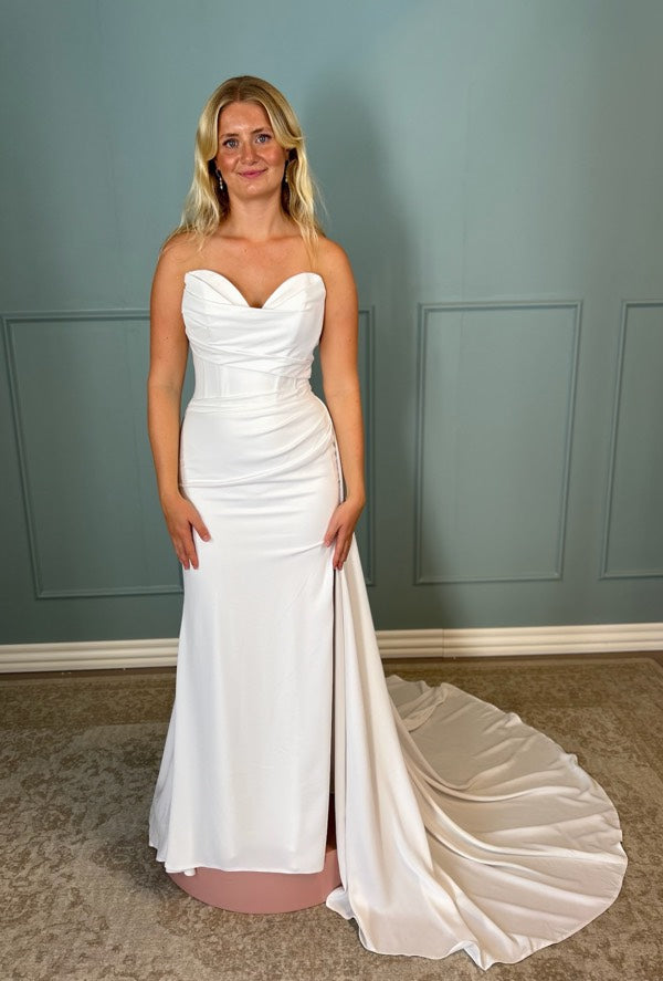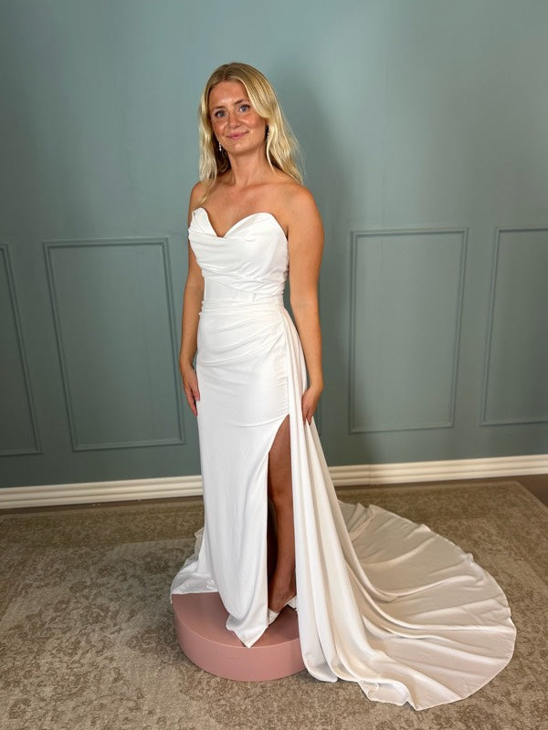 Brudekjole Belizzi er til dig, der ønsker et moderne og elegant look på bryllupsdagen. Kjolen er figursyet i glat satin, som giver et stilrent og tidløst udtryk. Den har en smuk sweetheart-udskæring og draperinger i livet, der fremhæver taljen på en naturlig måde.