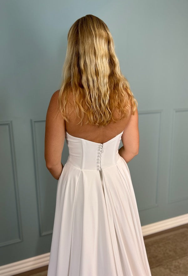 Denne kjole er perfekt til bruden, der leder efter en simpel brudekjole i satin, en stropløs brudekjole med slids, eller en moderne brudekjole med slæb. Belizzi kombinerer enkelhed med små detaljer, som gør kjolen både praktisk og smuk at bære gennem hele dagen.