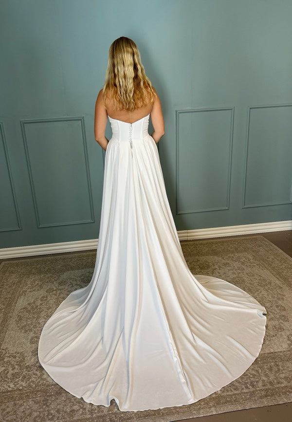 Skørtet falder slankt og fortsætter i et langt slæb, som giver kjolen et klassisk præg. En slids i siden gør designet mere let og giver frihed til at bevæge sig, samtidig med at kjolen får et sofistikeret udtryk. Bagpå lukkes kjolen med knapper, som fuldender det elegante design.