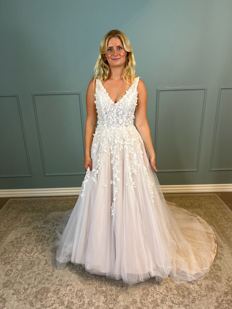 Brudekjole Ceci – romantisk blonde, 3D blomster og let tyl. Denne brudekjole er til dig, der ønsker et feminint og eventyrligt look på din store dag. Kjolen har et smukt V-formet bryst og ryg, som giver en elegant udskæring. Overdelen er udsmykket med fine blondeblomster i 3D-effekt, der giver kjolen dybde og et moderne, luksuriøst udtryk. De smukke blomster fortsætter ned over det luftige tylskørt, hvor de nærmest svæver ovenpå stoffet og skaber en let og drømmende følelse. Skørtet falder blødt med et romantisk slæb, som fuldender kjolen.