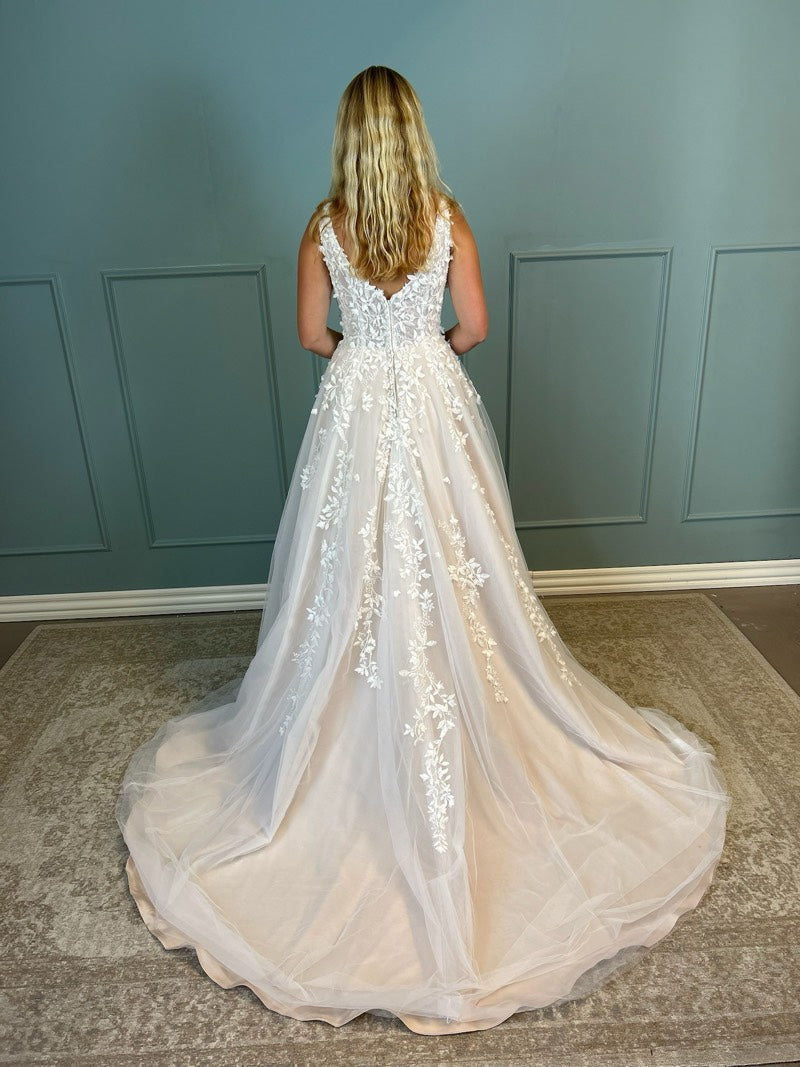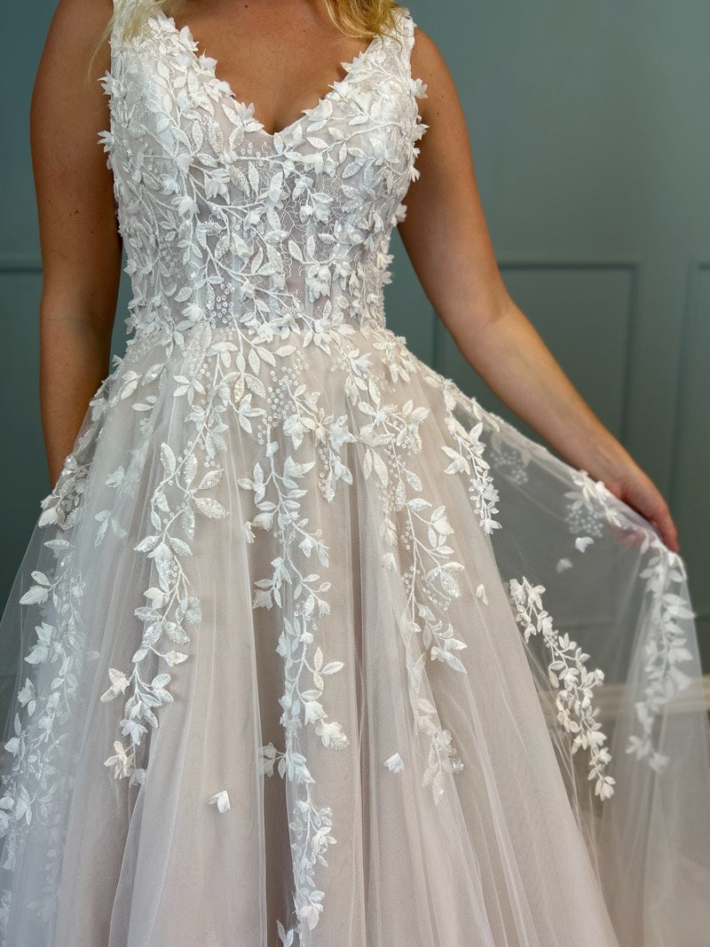 Brudekjole Ceci er perfekt til brude, der drømmer om en brudekjole med 3D blondeblomster, et feminint snit og et let skørt i tyl. Den passer til både klassiske og romantiske bryllupper – uanset om du siger ja i kirken, i haven eller ved stranden.