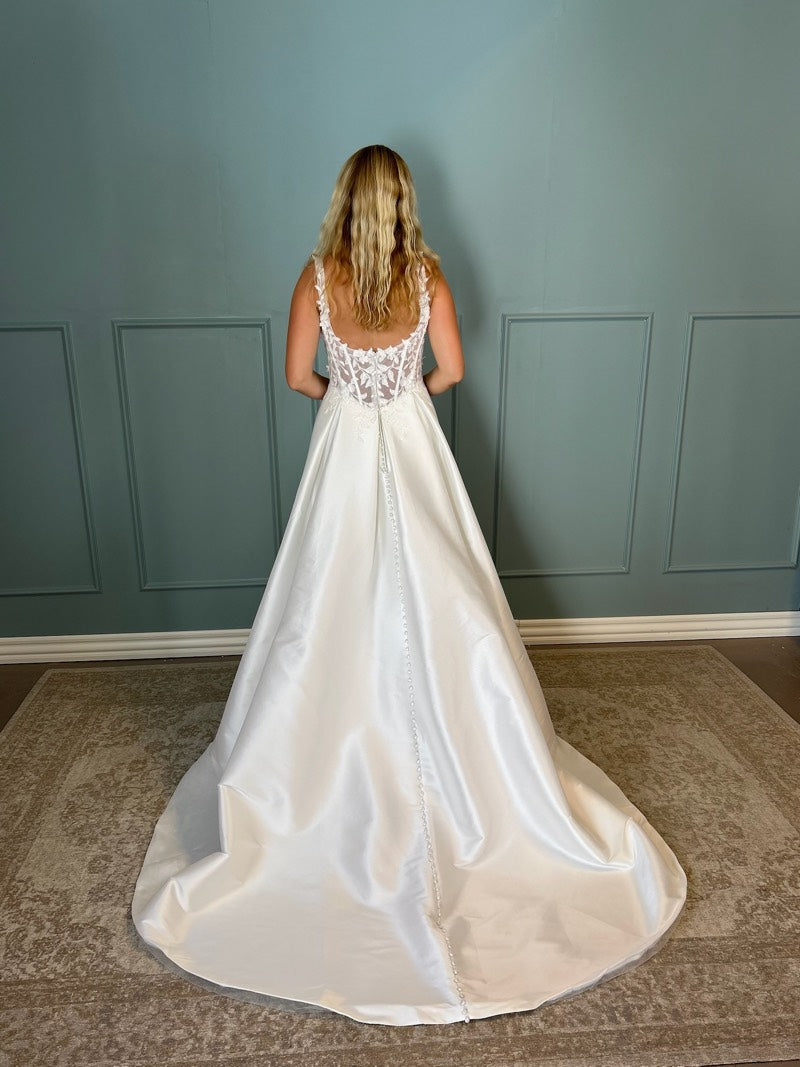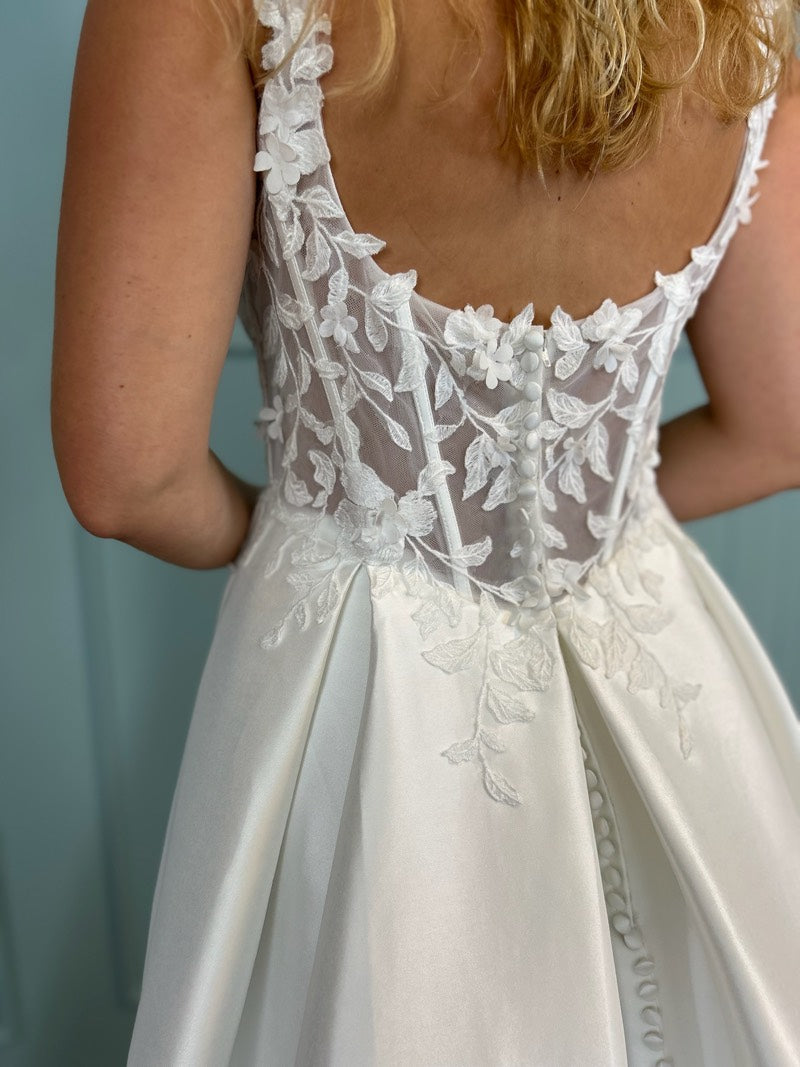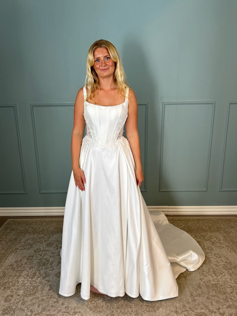 Brudekjole Claudia – smuk satin og romantiske blonder. Denne kjole er perfekt til dig, der drømmer om et klassisk og tidløst brudelook med et moderne twist. Den er syet i blank satin, som falder flot og giver et elegant udtryk. Livet har syninger, der former figuren smukt, og i siderne samt på ryggen er der gennemsigtige blonder, der giver kjolen et romantisk og let udtryk. Kjolen har A-line snit, illusion ryg med knaplukning, brede stropper, samt et elegant skørt med slæb, der fuldender looket. Brudekjole Claudia er ideel til både kirke- og havebryllup og passer til dig, der ønsker en brudekjole med satin og blonde, en brudekjole med A-line facon eller en brudekjole med smuk ryg i blonde.