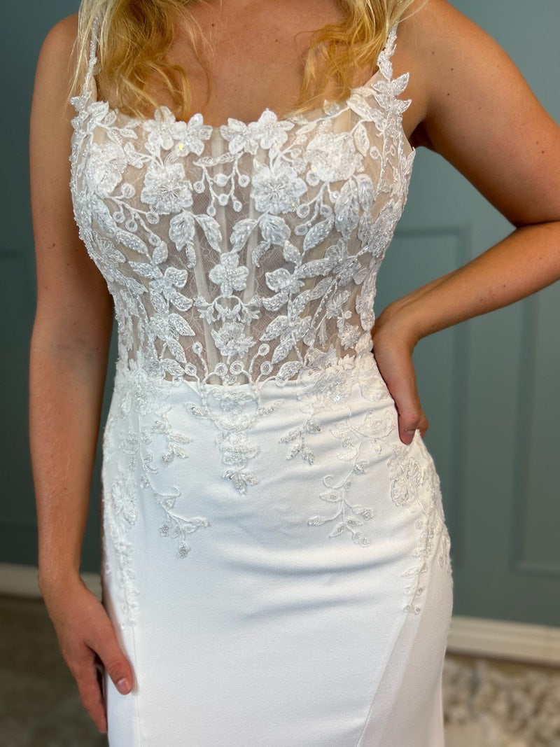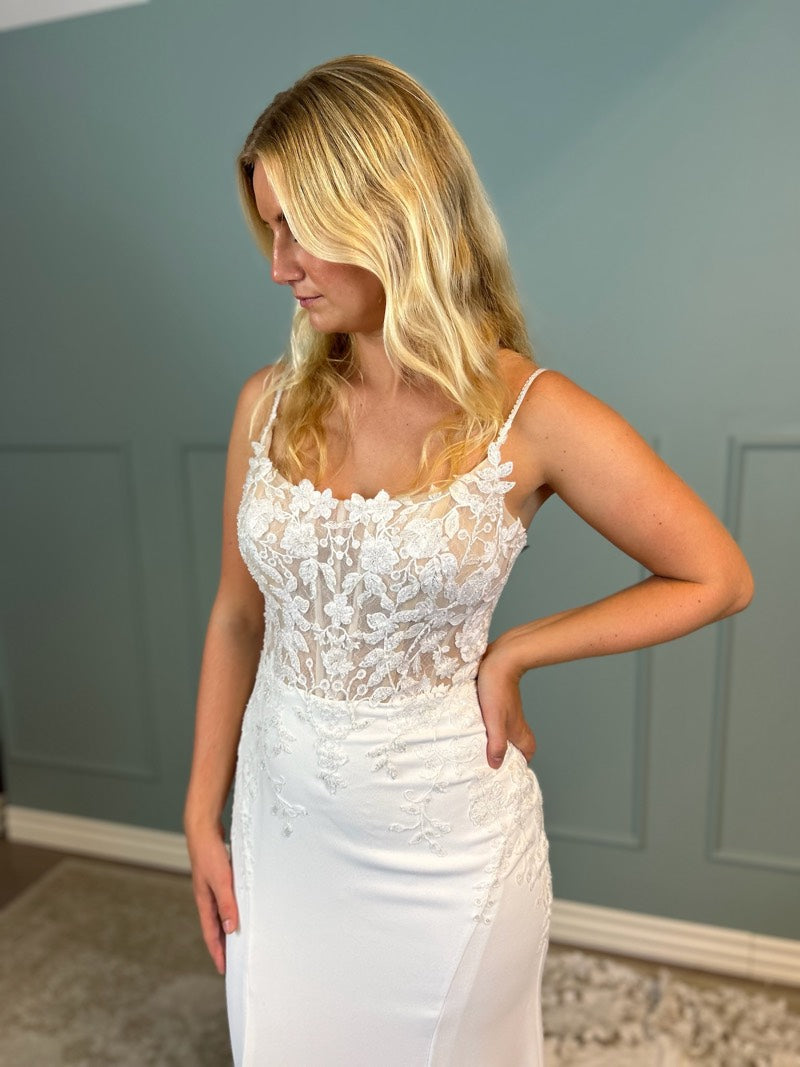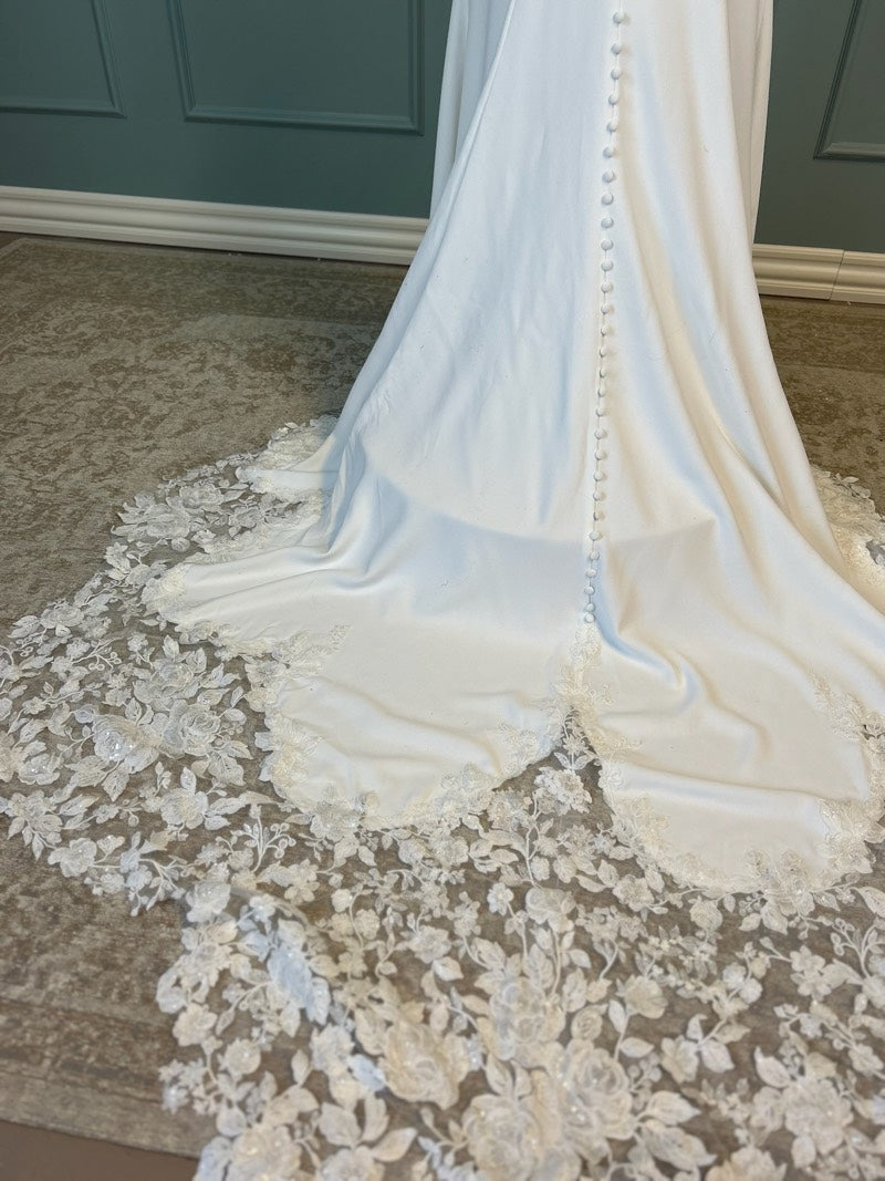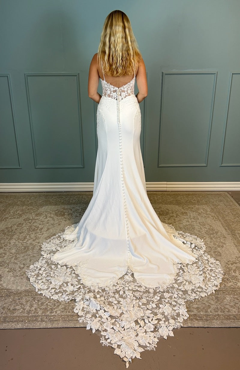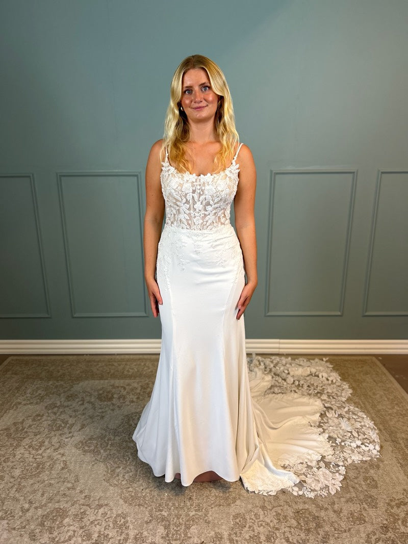 En romantisk og elegant brudekjole, der kombinerer tidløs enkelhed med fine detaljer. Kjolen har en smuk, tætsiddende silhuet med blonder på overdelen, der giver et let og feminint udtryk. Blondeapplikationerne fortsætter ned på skørtet og ender i et imponerende slæb med detaljeret blondekant, som skaber en uforglemmelig afslutning.