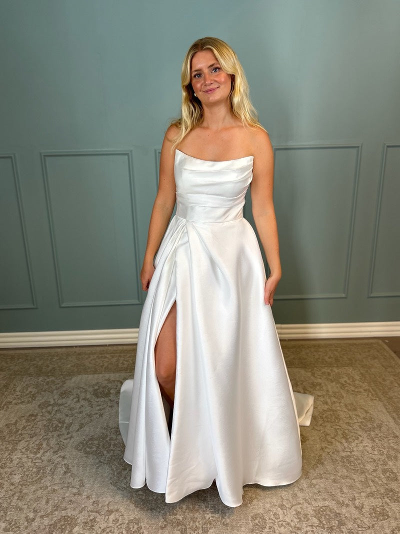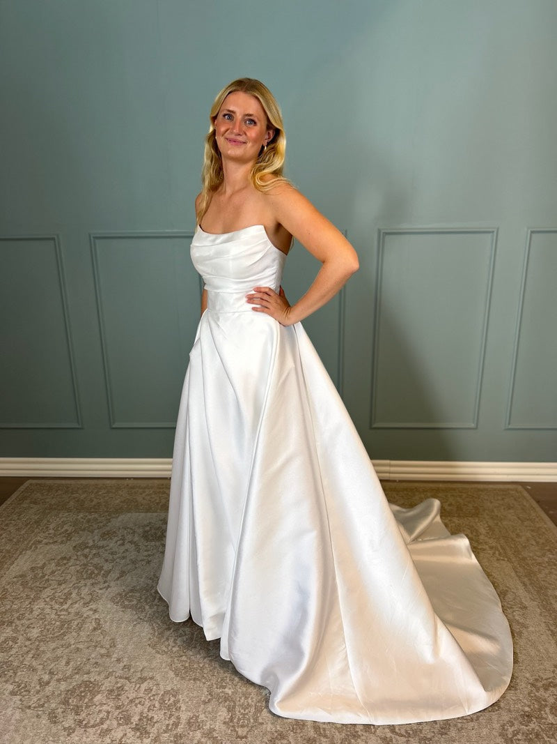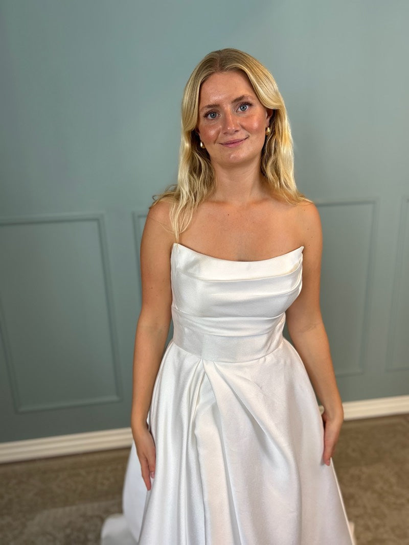 Fiorella brudekjolen er en tidløs og stilren brudekjole, der forener klassisk elegance med moderne detaljer. Kjolen er skabt i en smuk satin, som falder blødt og giver et eksklusivt udtryk. Det enkle corsage-inspirerede liv fremhæver taljen, mens den draperede topdel tilfører et feminint og sofistikeret touch.