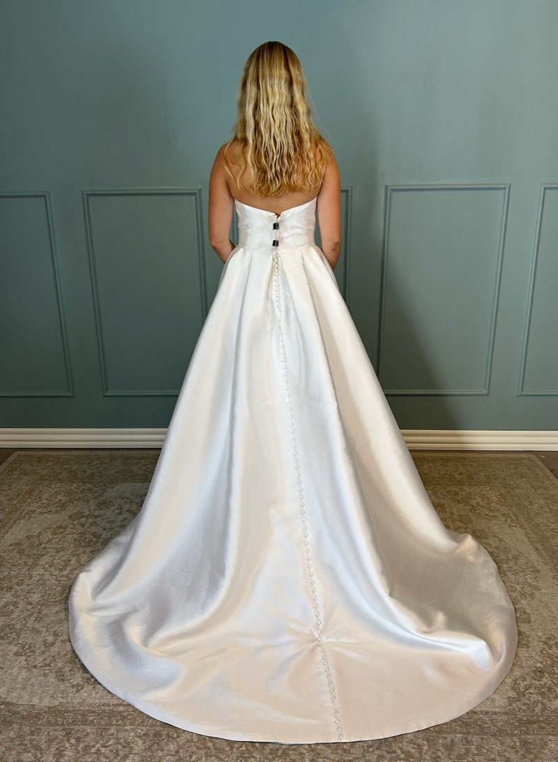 Skørtet har en let A-facon, som giver bevægelsesfrihed, og den høje slids i skørtet skaber et moderne og glamourøst udtryk. Bagpå fuldendes kjolen af en elegant knaplukning hele vejen ned gennem ryggen og et smukt langt slæb, der understreger kjolens romantiske look.
