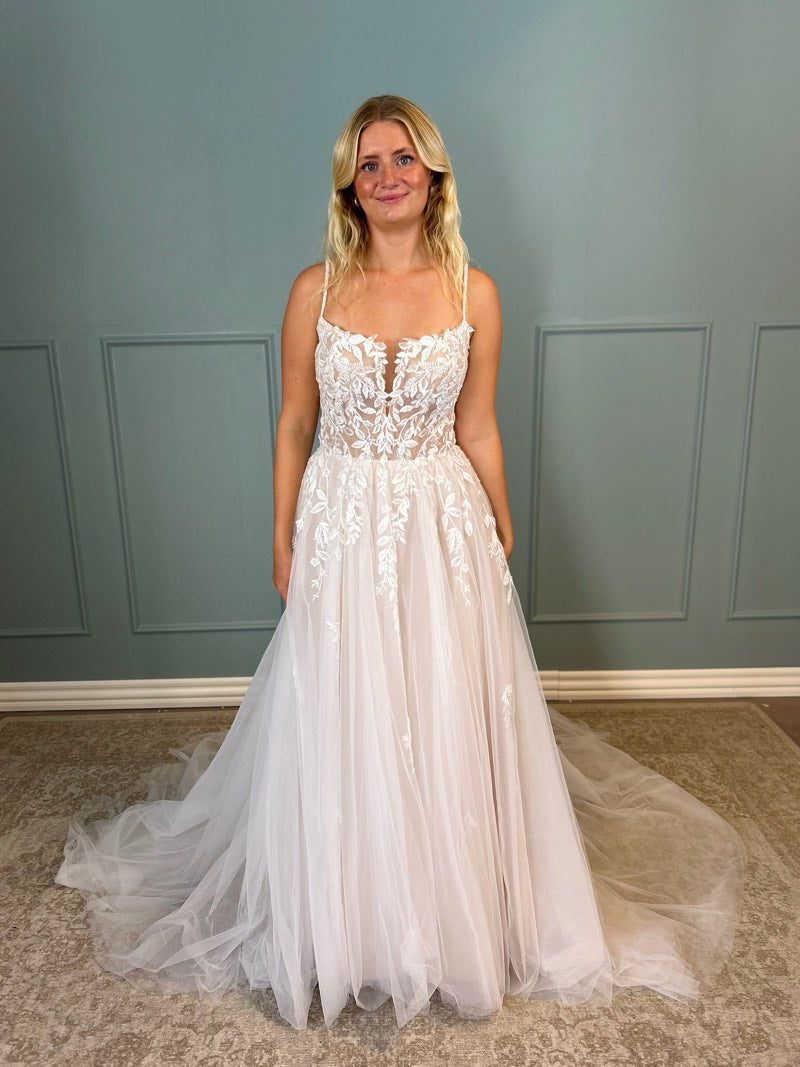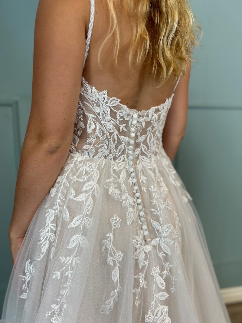 Brudekjole Fiorenza er en romantisk og eventyrlig kjole, der kombinerer et moderne snit med klassiske detaljer. Den har en smuk dyb V-udskæring foran og fine, tynde stropper, der giver et let og feminint udtryk. Korsagen er dekoreret med delikate blonder, der fortsætter ned i skørtet og giver kjolen et drømmende look.