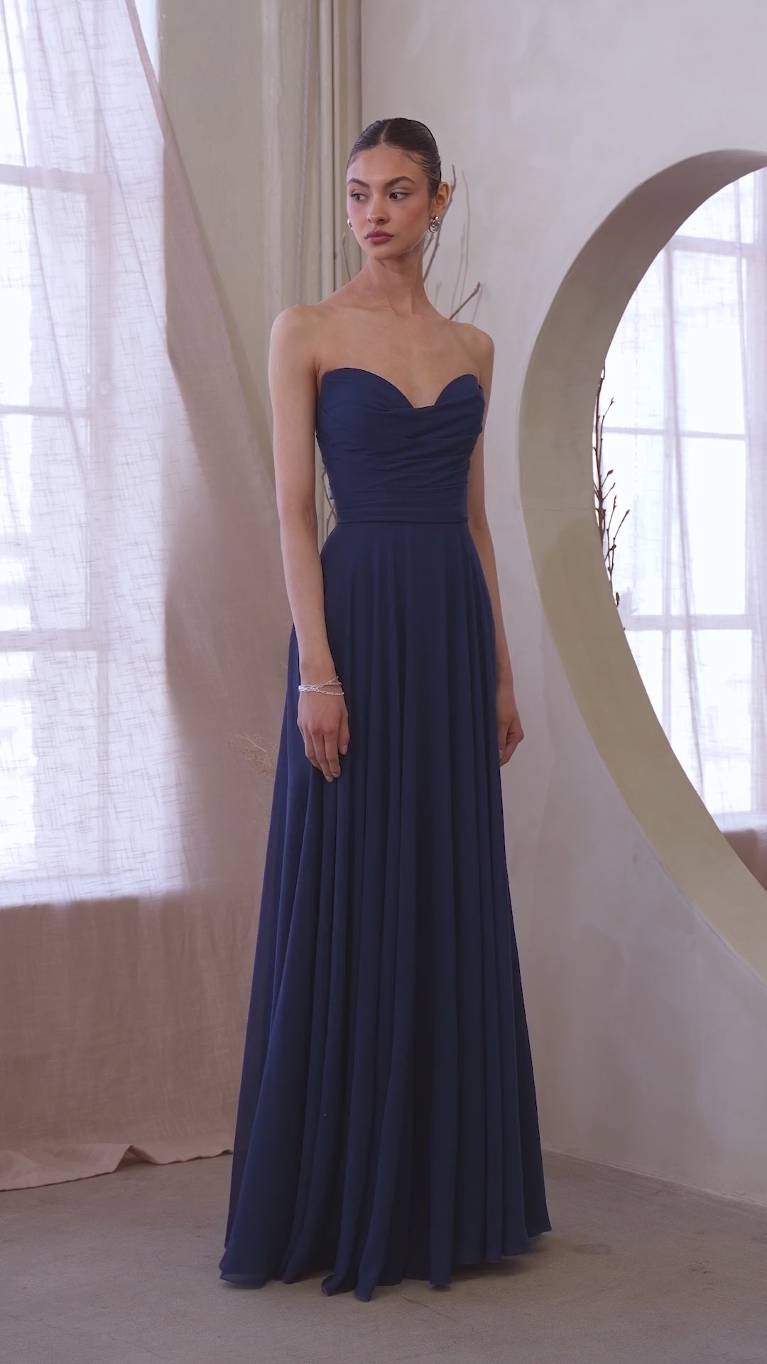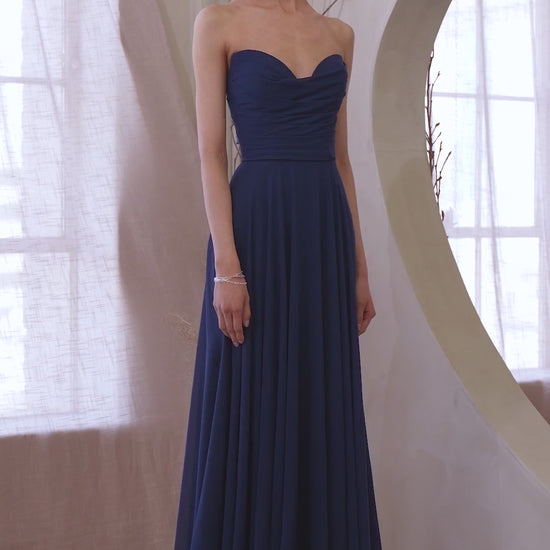 Smuk og klassisk A-line festkjole med draperinger på overdelen. Kjolen er stropløs og der følger et let og elegant tørklæde med.