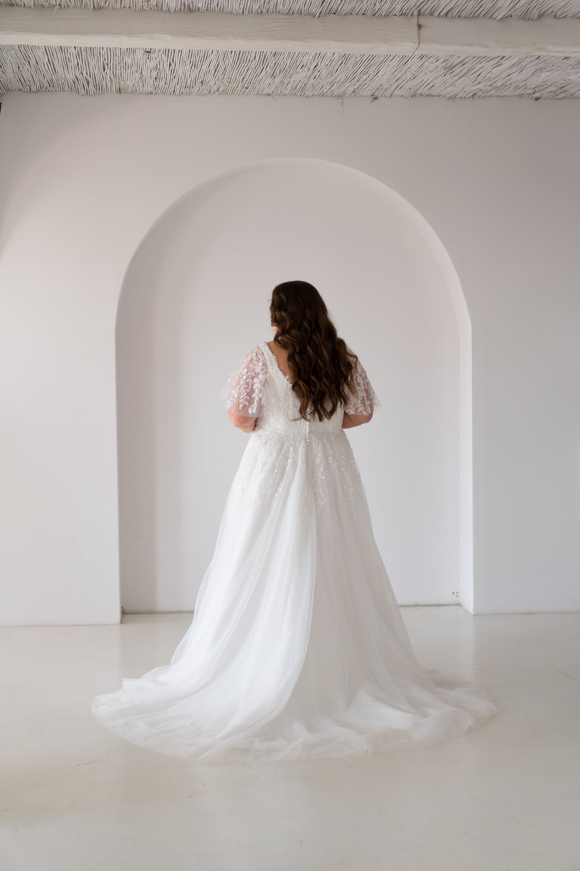 Vivian er en drøm af en brudekjole til den kurvede brud, der ønsker et feminint, let og elegant udtryk på sin store dag. Kjolen har en blød A-line silhuet, der falder smukt fra taljen og giver en fantastisk pasform til plus size. Det delikate blondearbejde over bryst og ærmer skaber et romantisk og blidt look, som klæder enhver figur.