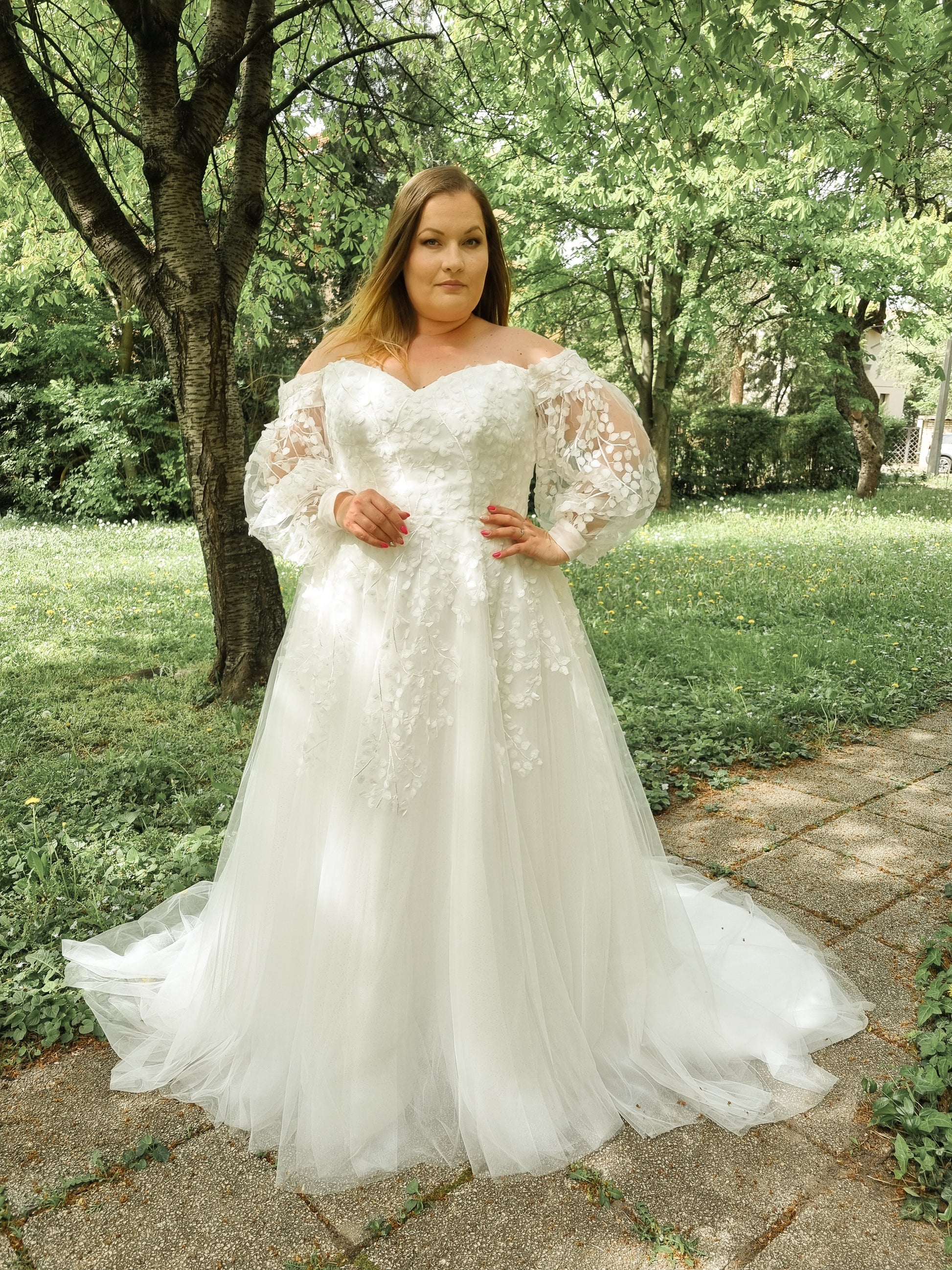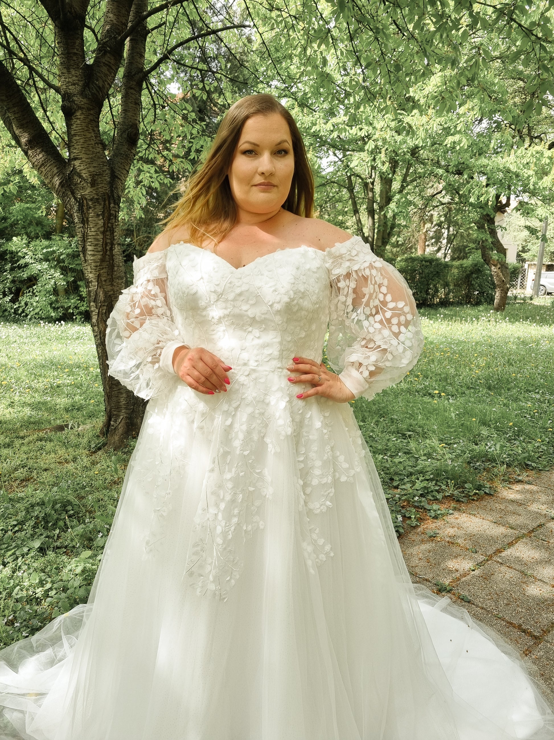 Zilla er den perfekte kjole til dig, der drømmer om et romantisk, feminint og blødt udtryk – og som gerne vil føle dig både støttet og fantastisk på din store dag. Kjolen er designet med et smukt hjerteformet corsage og voluminøse off-shoulder ærmer i gennemsigtig tyl, udsmykket med 3D-blondeblade der giver et let, drømmende udtryk.
