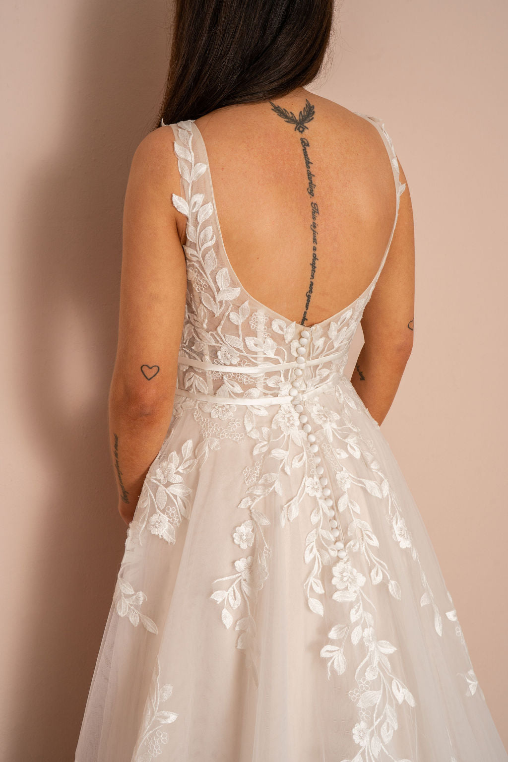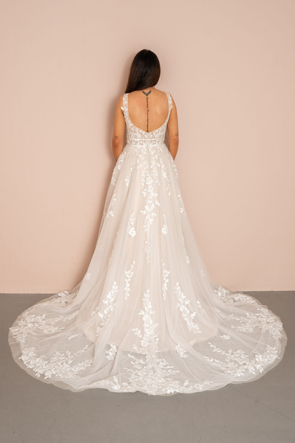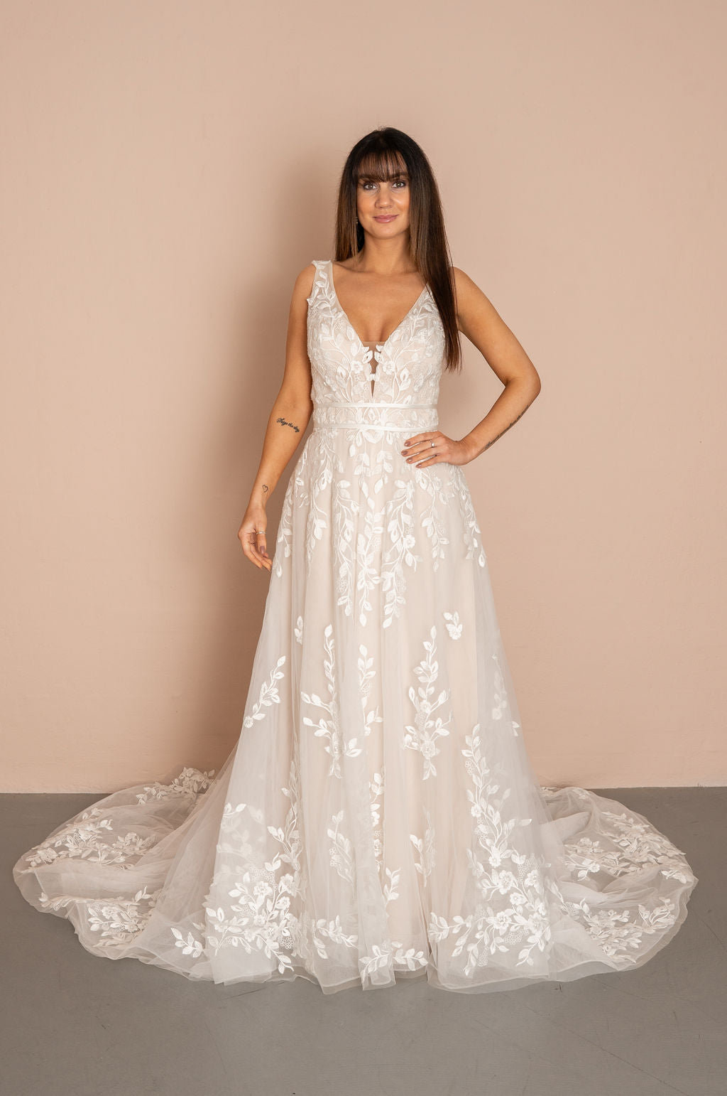 Arenella brudekjolen er her vist i nude, den fås også i helt ivory.