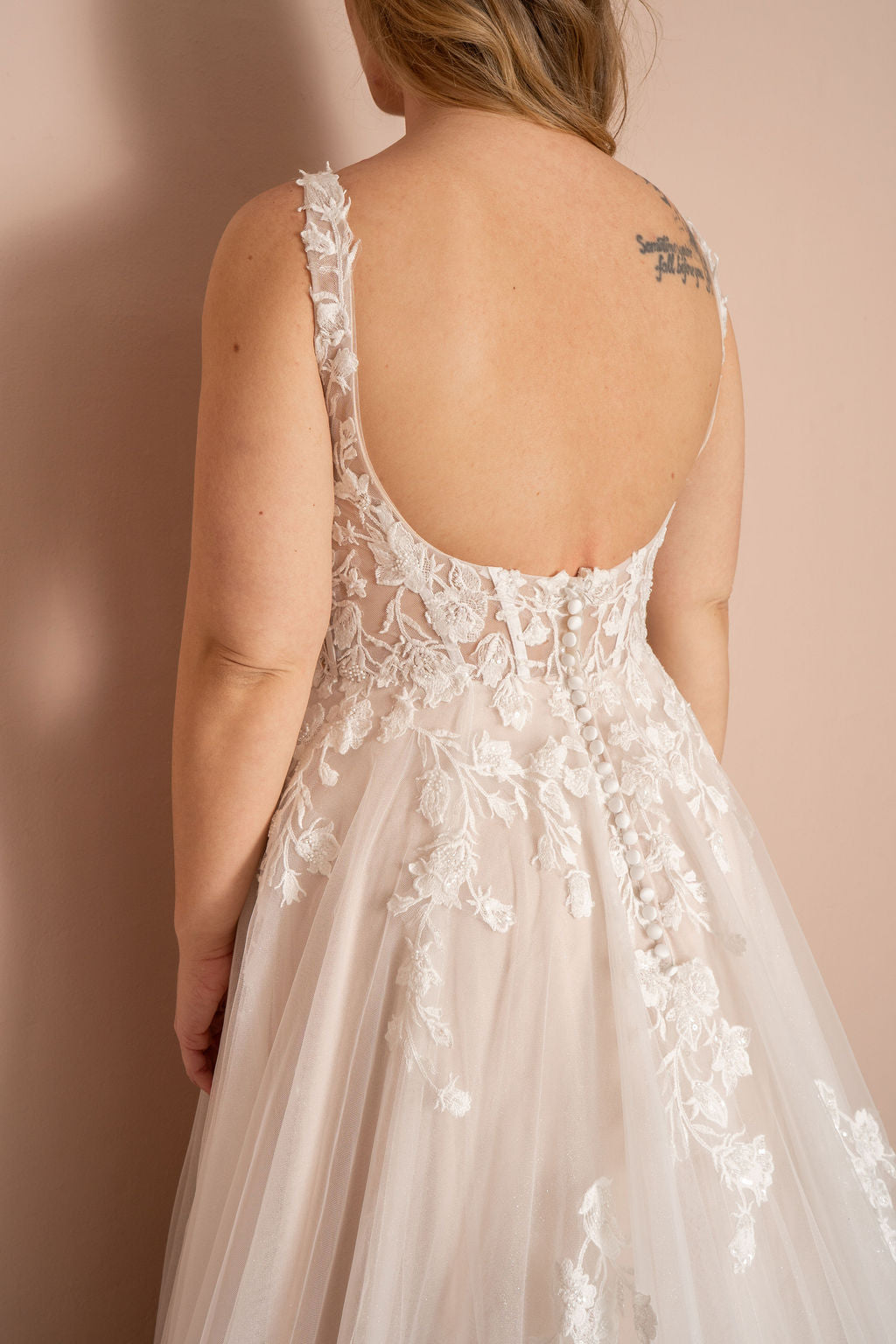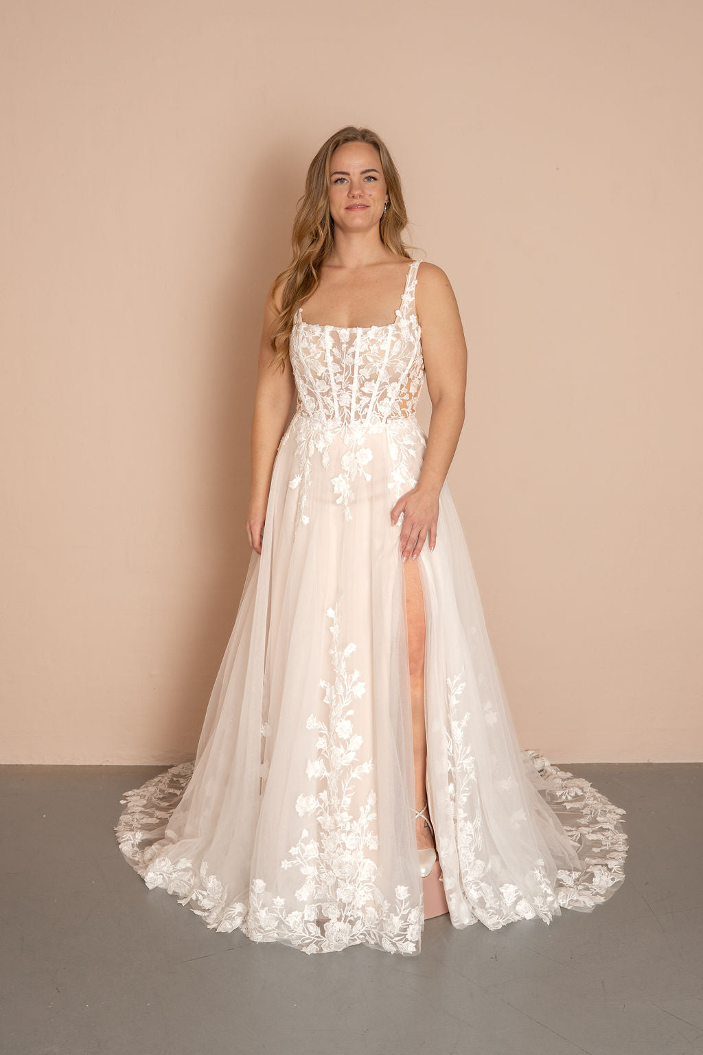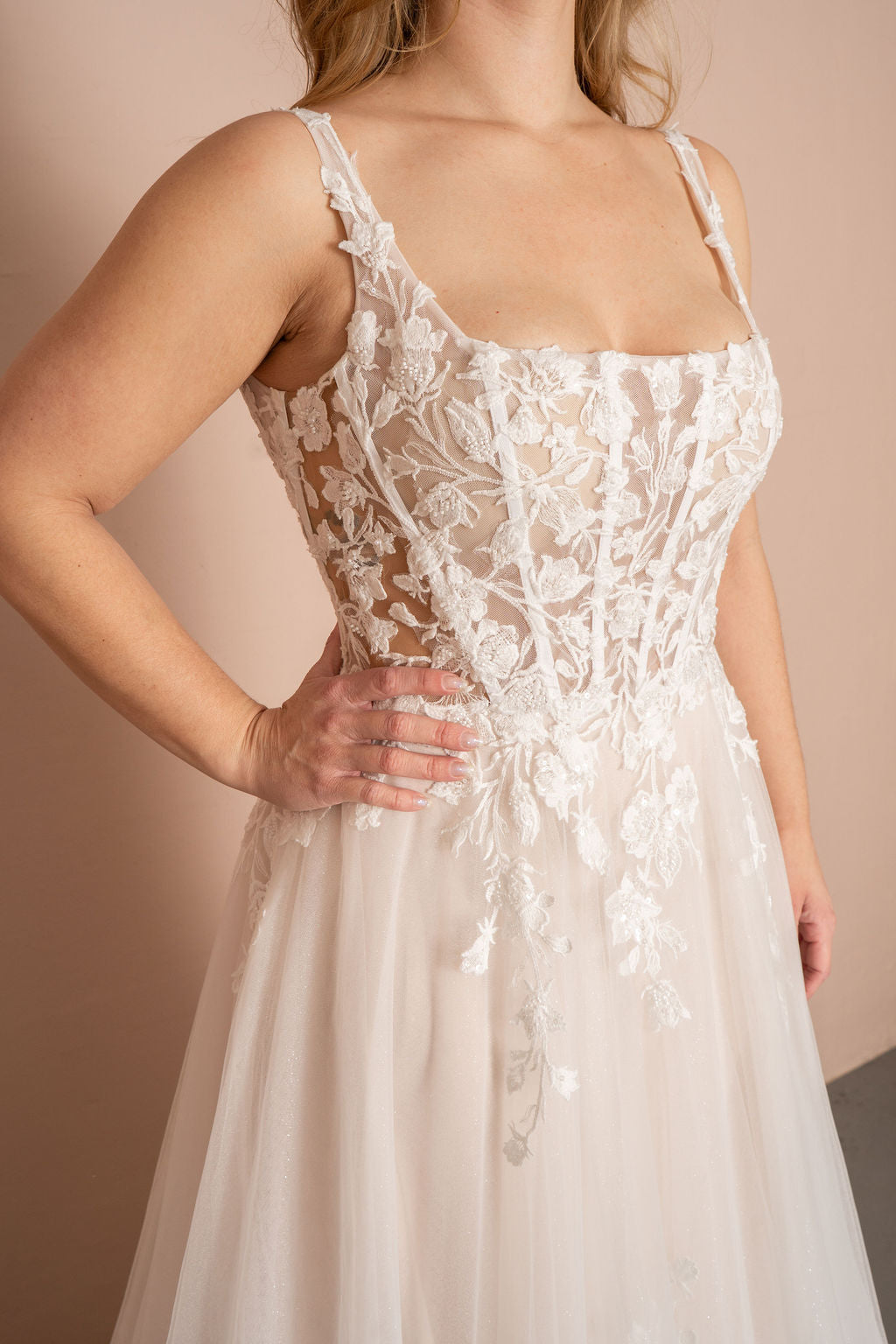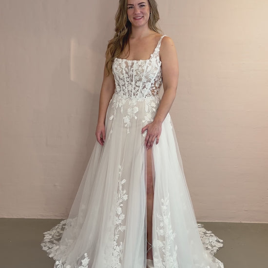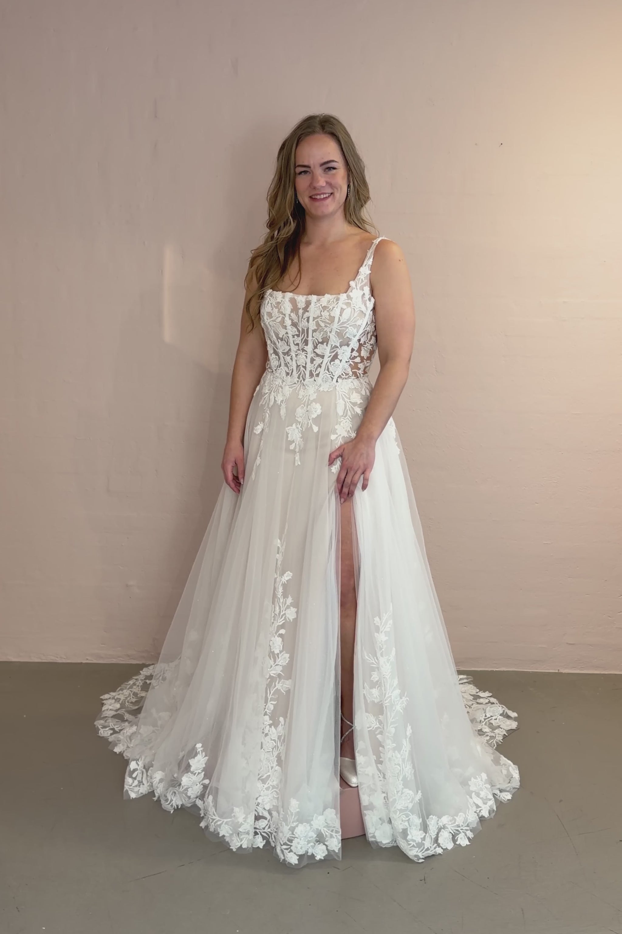 Celestina er en virkelig fin brudekjole med square neckline og de fineste blonder