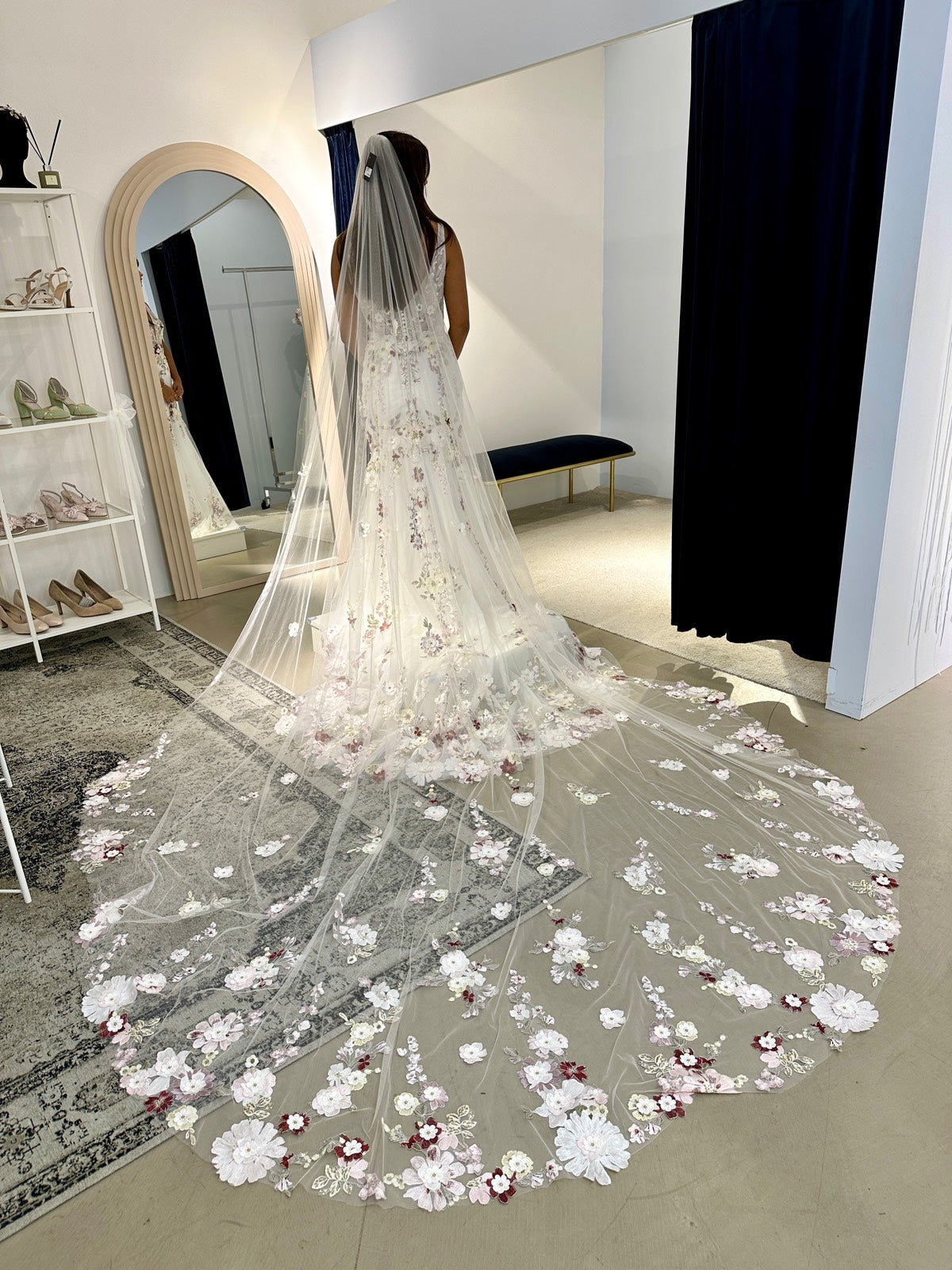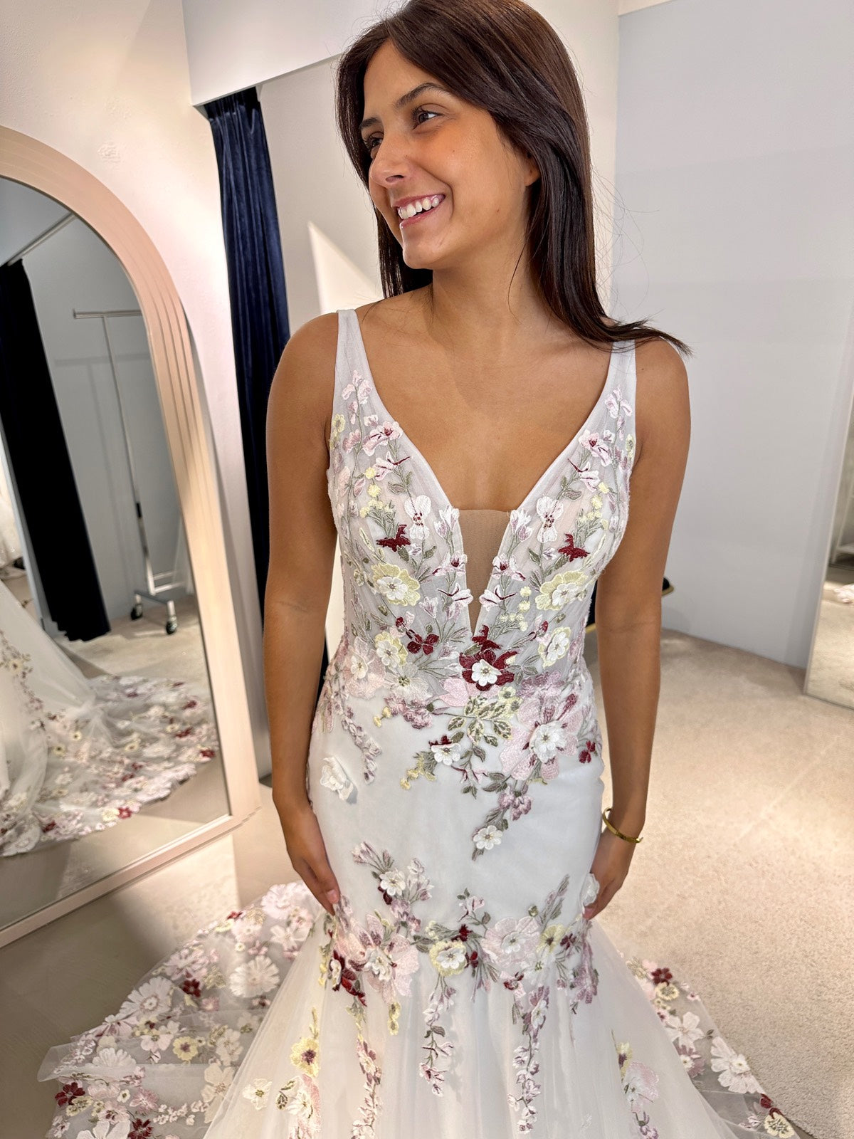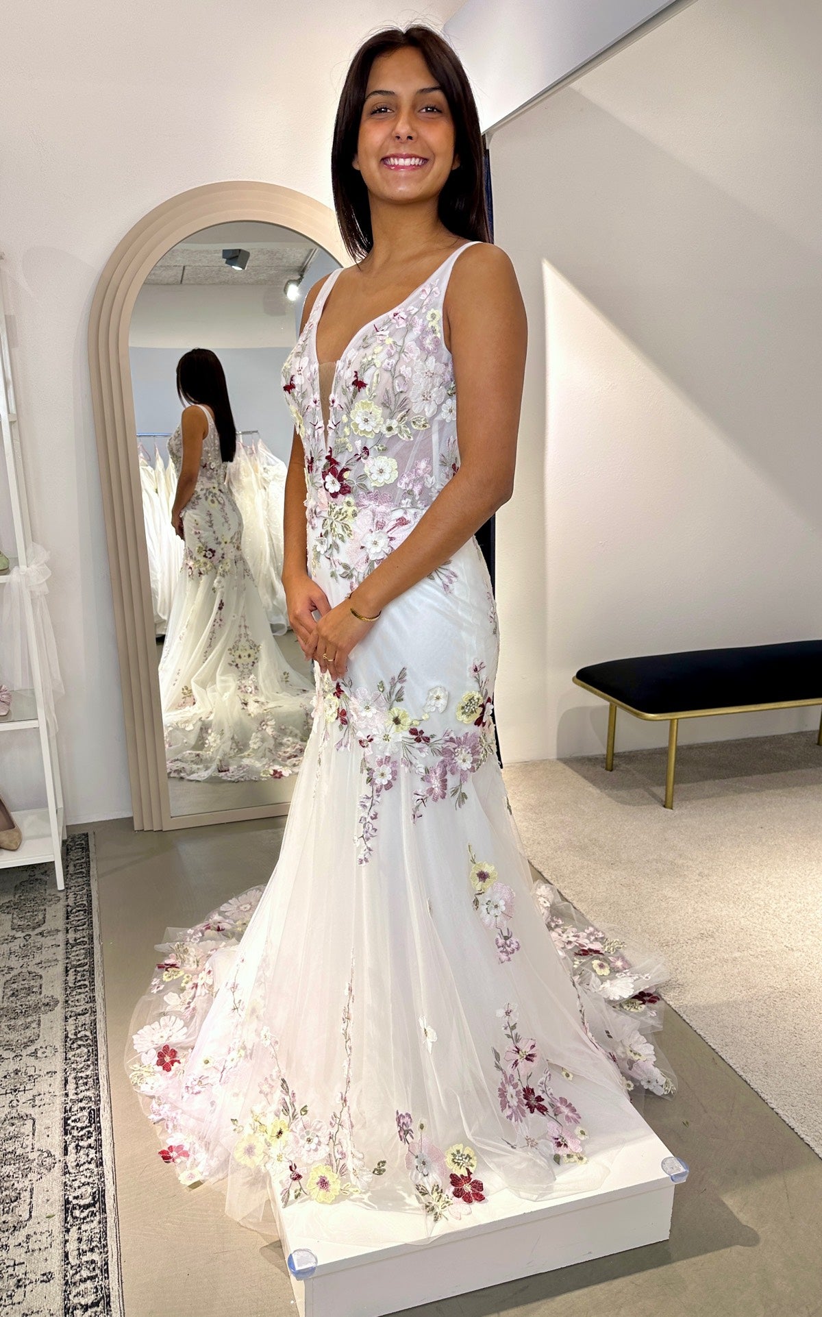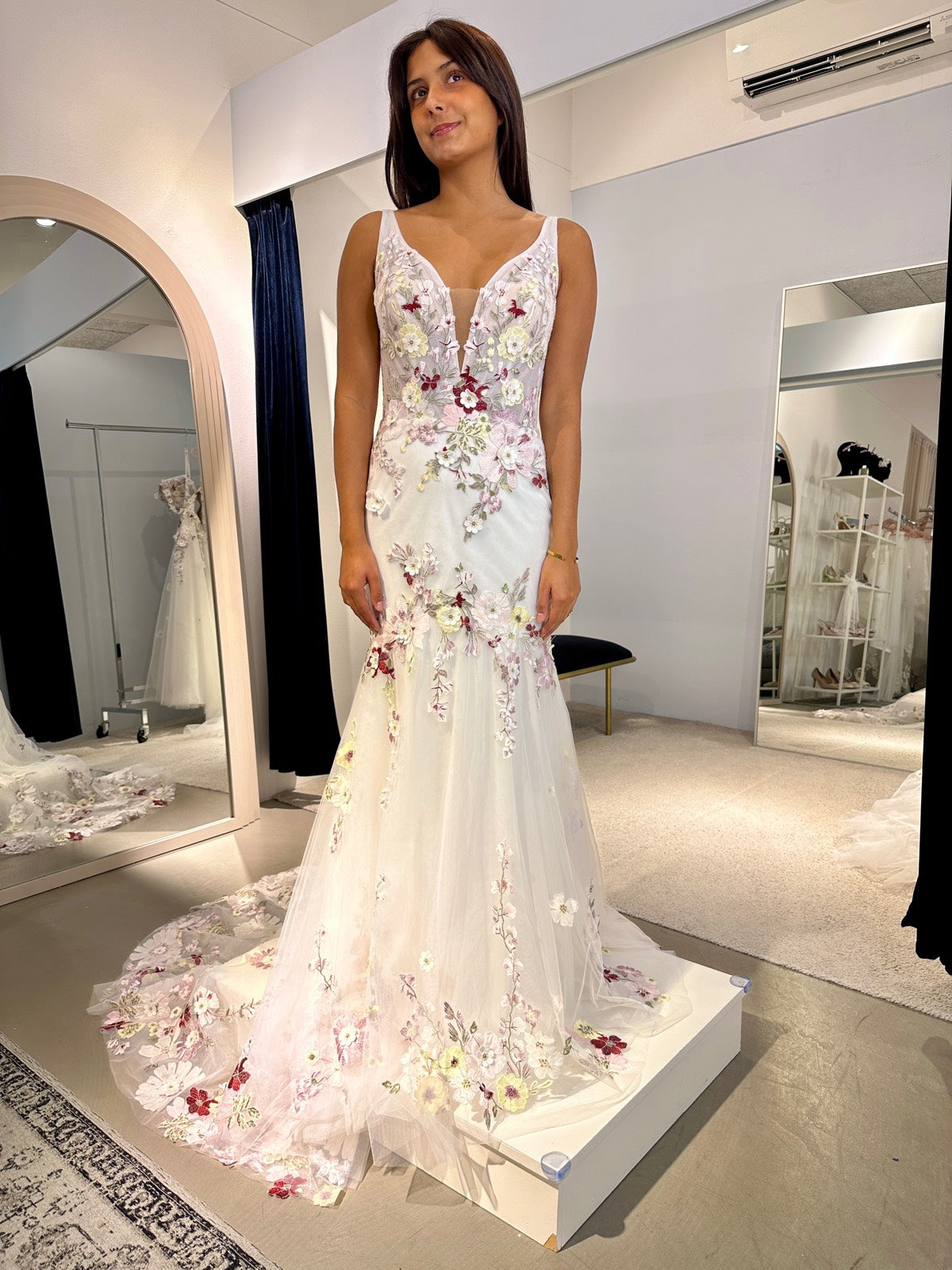 Brudekjolen med blomsterne kan prøves og bestilles i butikken.