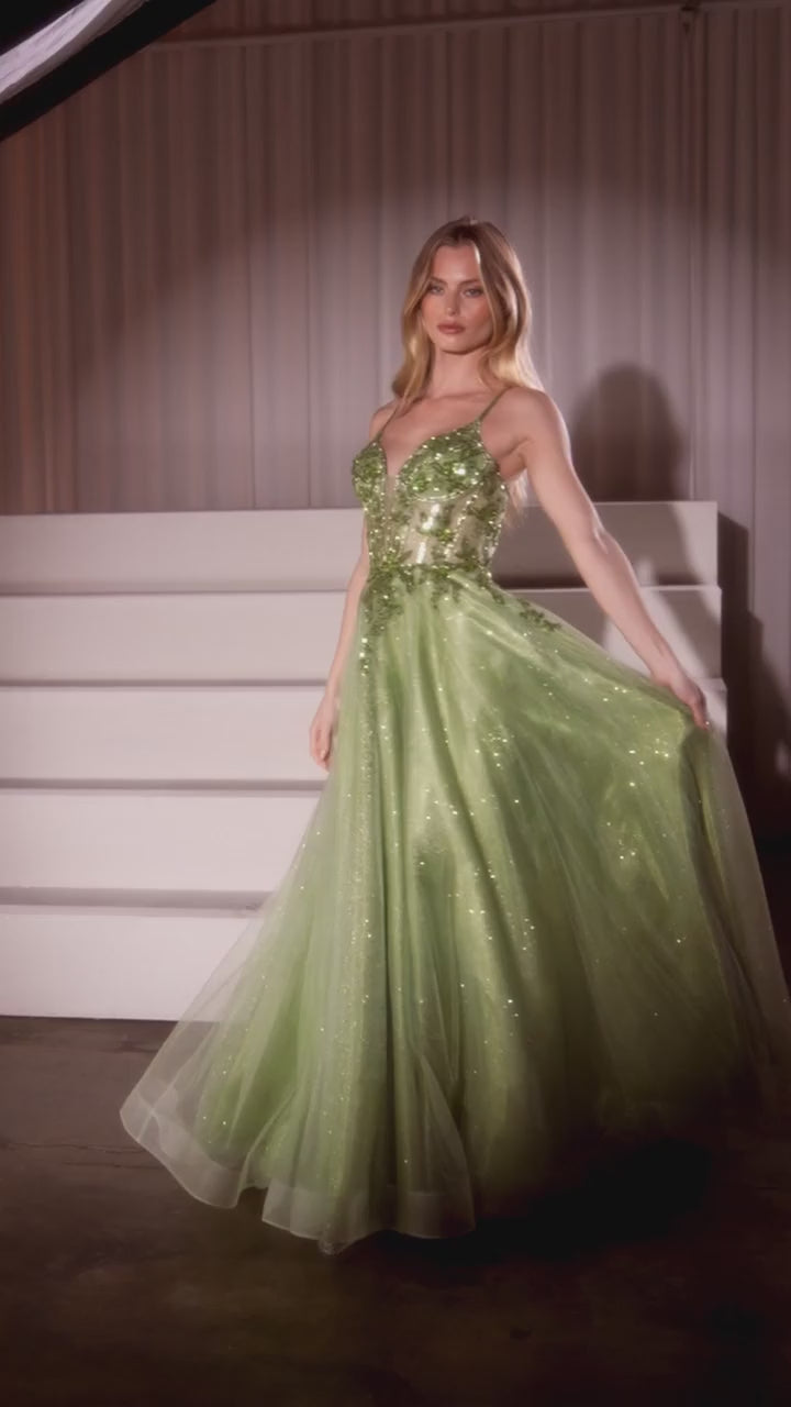 Smuk A-line gallakjole med let transparent corsage overdel, som er smukt dekoreret med krystaller. Kjolen har flot v-udskæring og helt smalle stropper. Det store tylskørt har masser af glitter og fuldender prinsesse følelsen.
