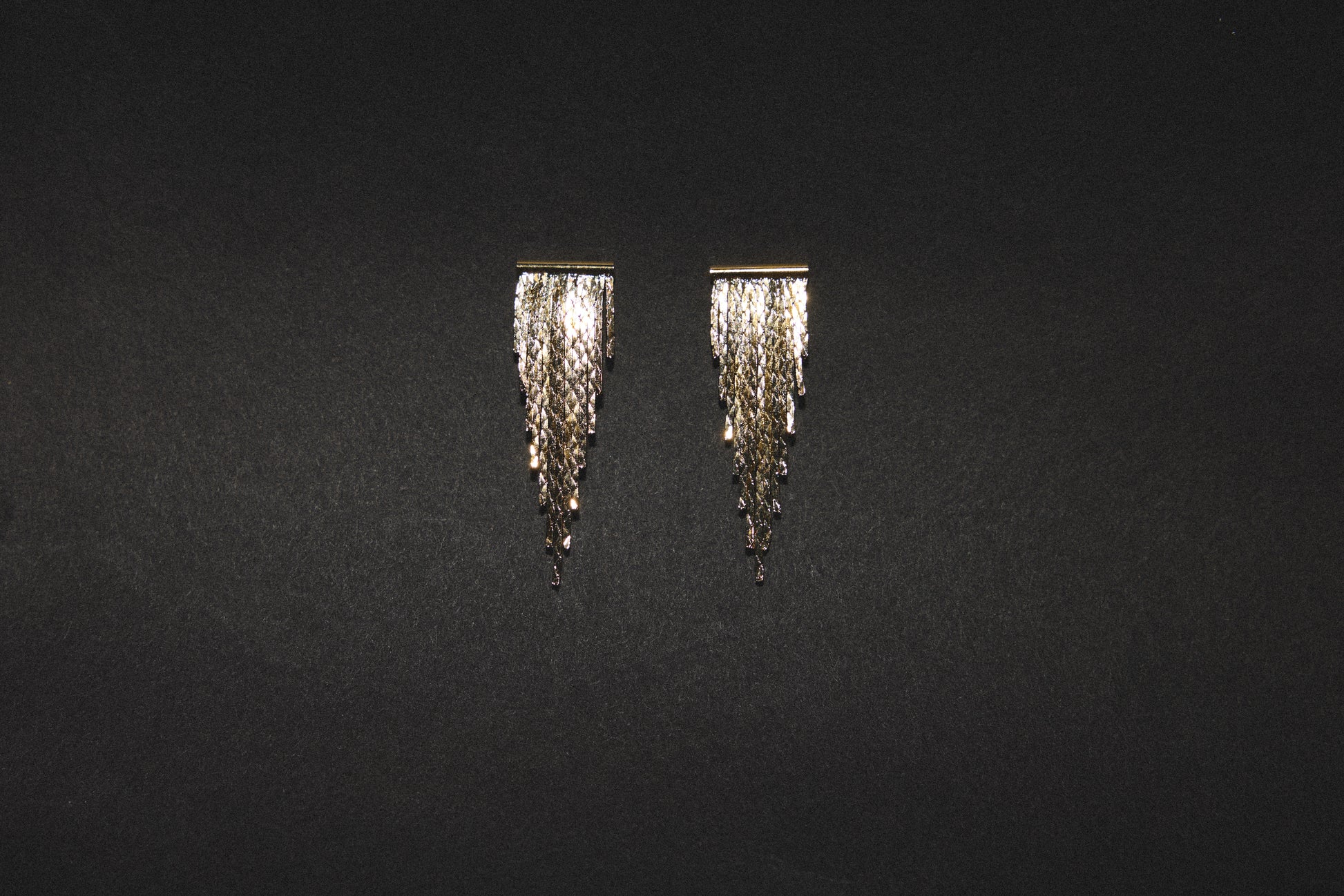 Elegante øreringe med en række kæde, der slutter i et V fra Friihof+Siig. Øreringene har et feminint boheme udtryk, som passer til de fleste lejligheder.