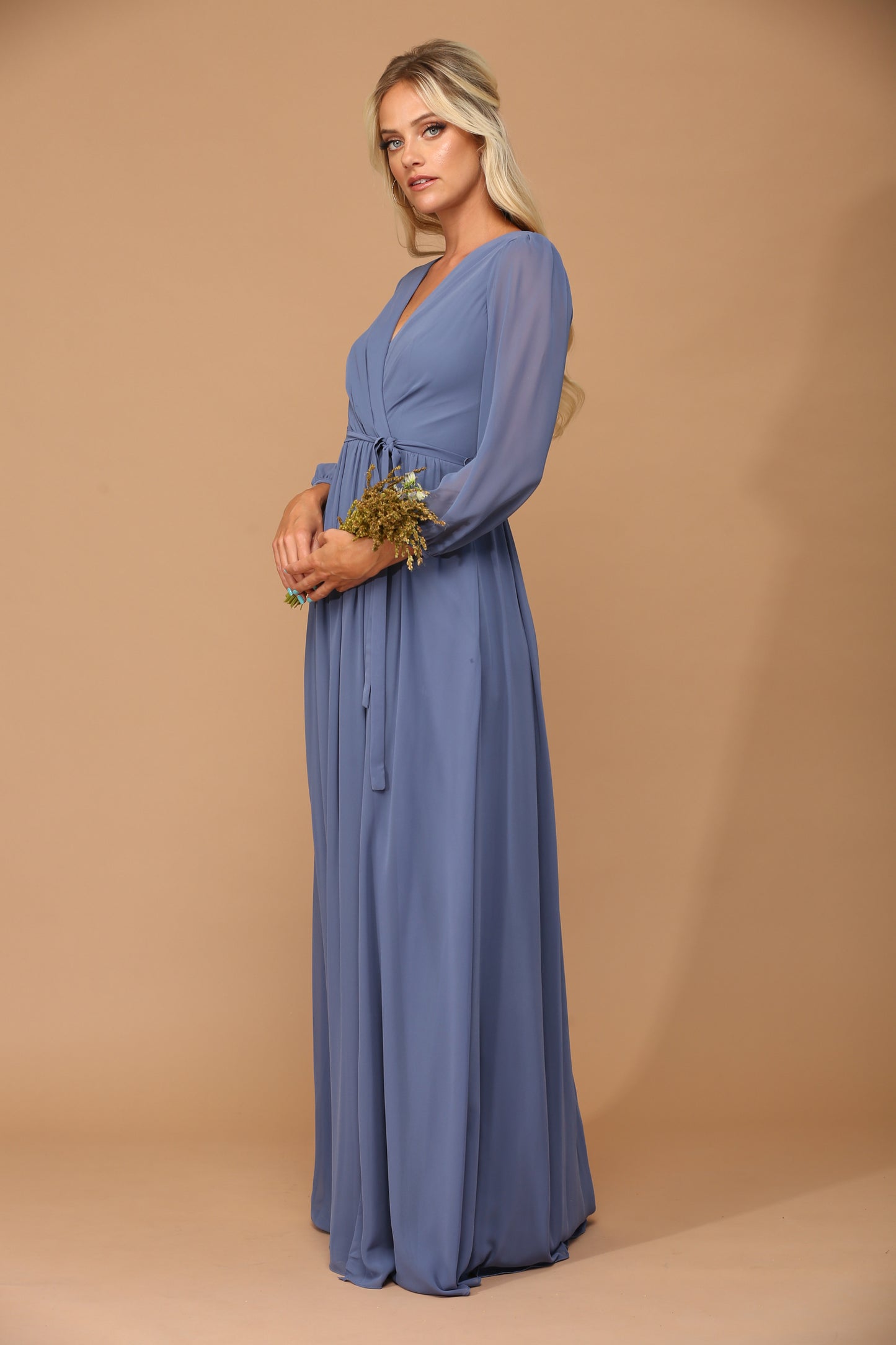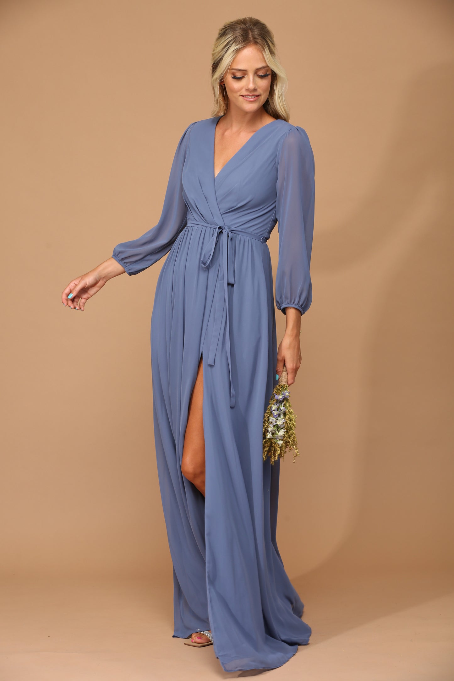 • Lang festkjole i chiffon med ballonærmer, lommer og slids.